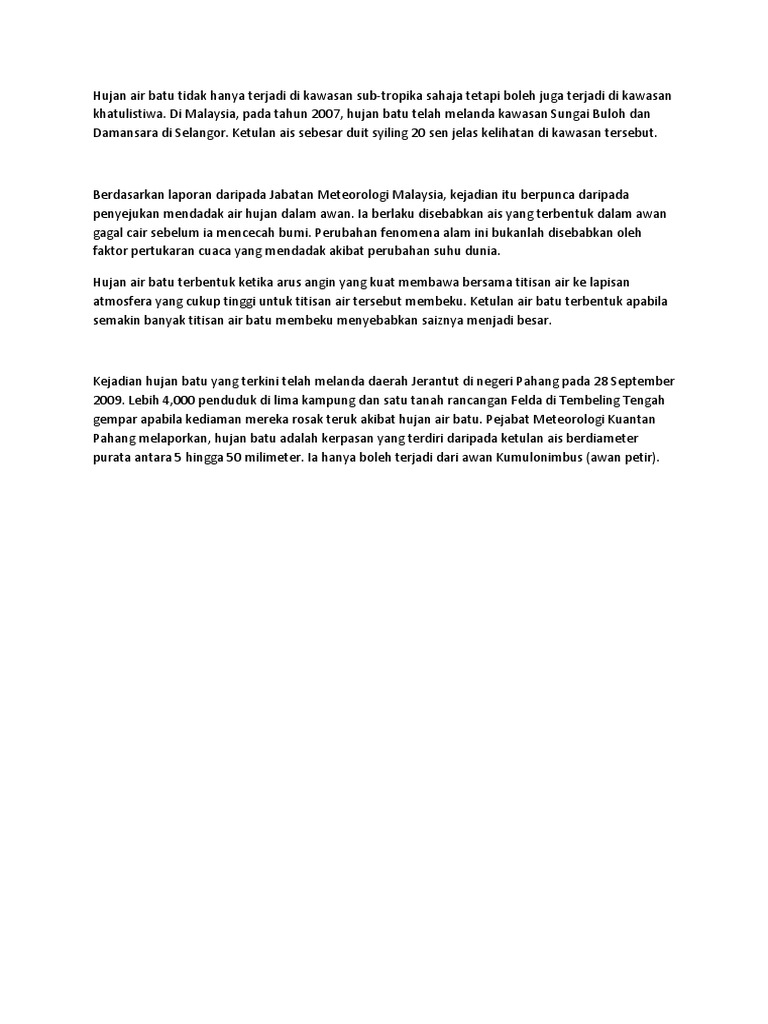 Hujan batu di ipoh perak ! Misi mencari kerja pun dilakukan. Jabatan meteorologi malaysia berperanan untuk memantau dan mengeluarkan amaran berkaitan cuaca dan bencana alam seperti hujan lebat, ribut , taufan, ombak dan tsunami di malaysia. Video terkumpul hujan batu ais yang melanda malaysia di kuala lipis, pahang & kuching, sarawak pada ogos ini. Sangat cocok buat yang ingin merasakan menginap di hotel rasa nusantara, dari kamarnya, lokasi, makananya tersedia semua menu kami datang saat hujan lebat, proses cek in cepat.